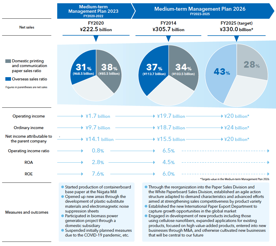 While securing stable profit on the foundation of printing, communication paper, and other areas of the paper business, the Group is actively expanding into new business domains through M&A and business alliances domestically and internationally to address contracting demand and changes in market structure under the advance of digitalization.In recent years, along with the expansion of our overseas business we are expanding business into new growth sectors including containerboard base paper and packaging and paper processing products for use as alternatives to plastics.